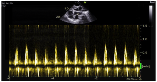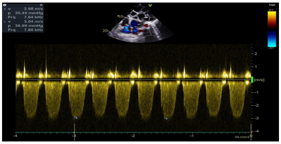 - Grade II tricuspid insufficiency was identified, with an estimated systolic pulmonary arterial pressure of 47 mmHg (calculated as 37 + 10 mmHg), indicating the presence of pulmonary hypertension.