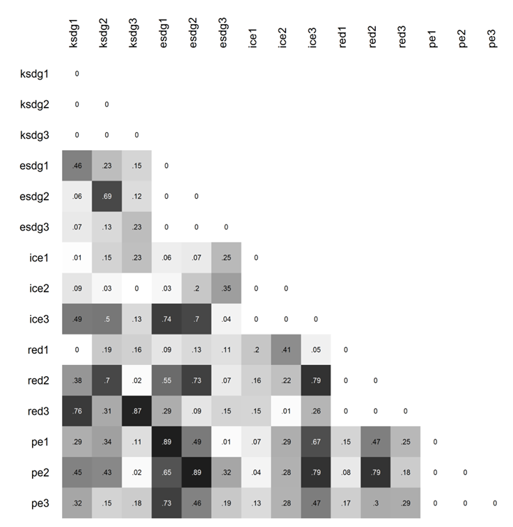 The analysis of covariances between the factors indicates the contrast of the theoretical structure with respect to the empirical observations (see Fig. 1). The results show values close to unity, which are assumed as evidence of non-rejection of the hypothesis of differences between the theoretical structure and the observations of the present study. In addition, the non-inclusion of other reagents in the empirical structure is inferred.