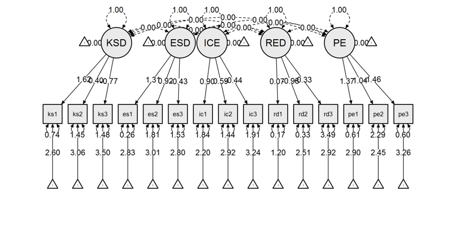 Structural analysis suggests confirmation of the relationships between the factors and indicators (see Fig. 2). The factor structure includes three cases of overestimation of the relationships between the first indicator of