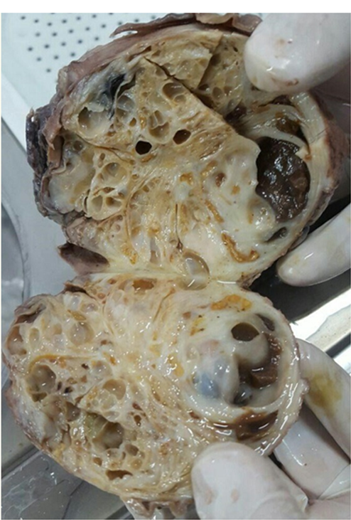 • Upon macroscopy examination, the tumours had been described as well-circumscribed tumours with a glistening or smooth surface and a multilocular cystic cut surface [24]