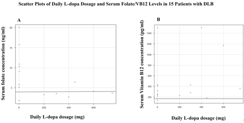 Figure. 2 illustrates these relationships, showing scatter plots of daily L-DOPA dosage and serum folate (A) and B12 (B) concentrations.