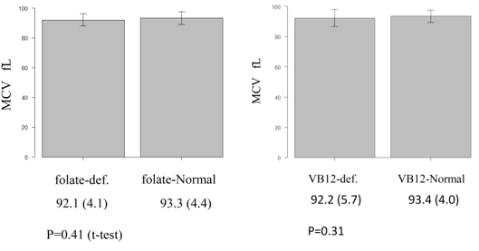 MCV did not differ significantly between participants with and without B12 deficiency (92.2 fL (5.7) vs. 93.4 fL (4.0), p = 0.31) or between those with and without folate deficiency (92.1 fL (4.1) vs. 93.3 Fl (4.4), p = 0.41), as determined by independent samples t-tests.