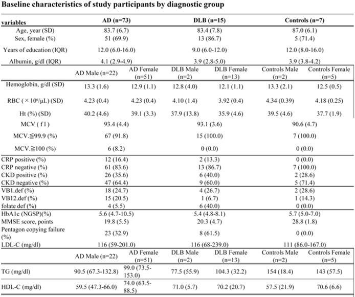 The cohort included 73 patients with Alzheimer’s disease (AD), 15 with dementia with Lewy bodies (DLB), and 7 cognitively normal controls.