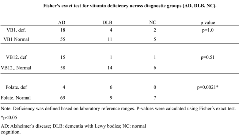 Table 2: Frequency of vitamin deficiency across diagnostic groups (Alzheimer’s disease [AD], dementia with Lewy bodies [DLB], and cognitively normal controls [NC]).