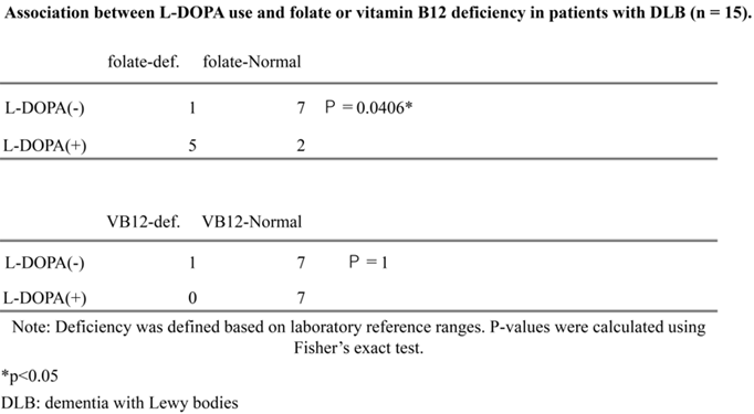 Table 3: Association between L-DOPA use and folate or vitamin B12 deficiency in patients with dementia with Lewy bodies (DLB, n = 15).