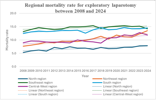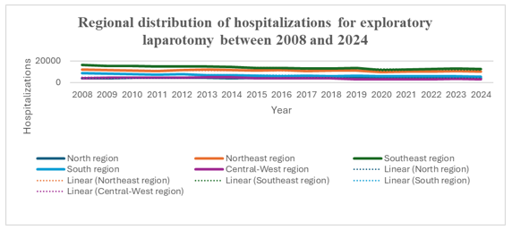 There is a general downward trend in the number of admissions for exploratory laparotomy in almost all regions of Brazil between 2008 and 2024. The only exception was the North Region, which showed atypical behavior, with an increase in the number of procedures. This disparity may be influenced by unequal access to imaging tests and health services, in addition to different clinical interpretations for surgery indications in each region. This may also be explained by the increase in the number of videolaparoscopic procedures that were not included in this study.