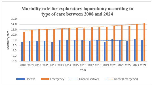 GRAPH 2: Mortality rate for exploratory laparotomy by region between 2008 and 2024.