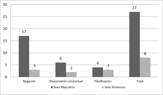 As can be seen in Figure 1, of the 28 people in the sample (80.0%) who adopted an Emotion-Focused Coping (EFC) strategy, 20 people (57.1%), 17 men and three women, adopted the Denial style; while eight (22.9%), six men and two women, adopted Behavioral Disengagement. Furthermore, seven people (20.0%), four men and three women, selected the Problem-Focused Coping (PFC) strategy, specifically the Planning style. The distribution of the different coping styles among the women was very similar, while among the men there was a slight predominance of the Denial style.