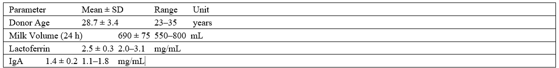 - Data Source: Mean concentrations of lactoferrin, IgA, and total antioxidant capacity were extracted from published Lebanese milk composition datasets [12–14].