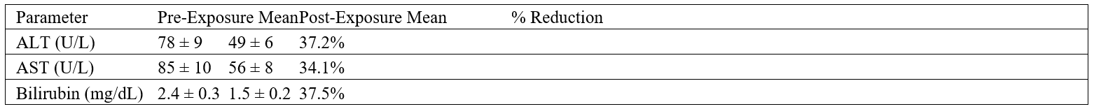 - Outcome Measures: Reduction in ALT, AST, and bilirubin following 24-hour simulated exposure.