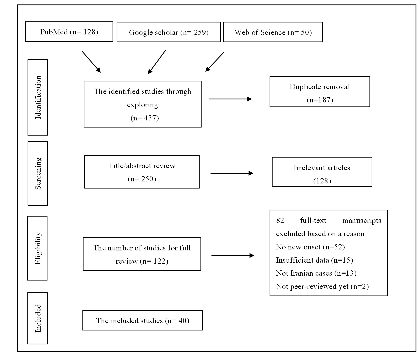 The initial search yielded 437 studies. After duplication removal, 250 papers were investigated regarding the titles and abstracts from which 128 articles were excluded according to the eligibility of the criteria including the case reports which had the same medical history or those with insufficient data. Eventually 40 manuscripts met the criteria of the systematic review.