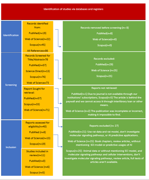 The present systematic review was conducted to fill this gap by (i) consolidating current evidence on AI and ML applications for predicting molecular pathway activity following SCI, (ii) summarizing the performance and methodology of these models, and (iii) identifying recurrent molecular signatures and mechanistic themes that can inform targeted therapeutic development within a regenerative medicine framework. By critically evaluating the strengths, limitations, and translational prospects of AI- bioinformatics approaches, this work aims to provide a comprehensive resource for guiding future research and accelerating the bench-to-bedside translation of pathway-specific interventions for SCI.