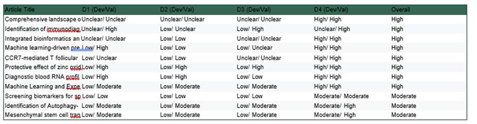 • Serious risk of bias – Predominantly small, non-representative cohorts; heavy reliance on GSE151371; absence of independent multicenter validation.