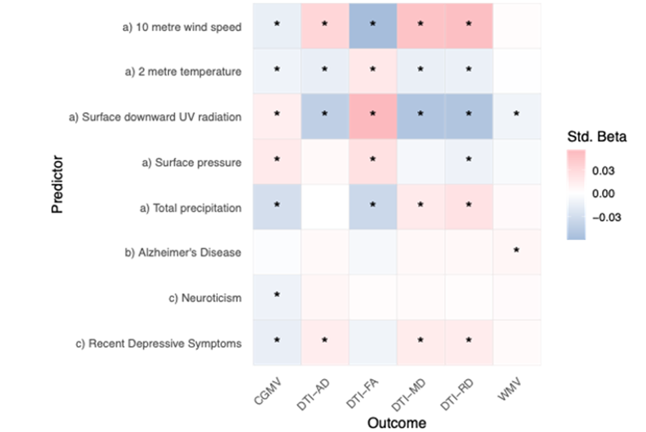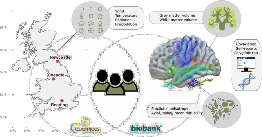Figure:1: Study design: Monthly meteorological data were linked to structural brain imaging (N = 30,831), yielding measures of grey matter volume, white matter volume, and white matter microstructure (diffusiometrics). Genetic risk scores and self-reported mental health data served as comparison variables. We linked atmospheric data averaged over the United Kingdom for the month precedingthe health and MRI assessments (Fig. 1). The derived averaged atmospheric indices were joined with individuals’ brain metrics for all 30,831 participants at baseline (see Table 1 in the Online Methods for an overview of key variables), and for n=4,294 at follow-up (Supplemental Table 1). As a comparison to atmospheric variables as predictors of brain structure, we also used self-reports of mental health, correspondingly polygenic risk scores (PGRS) of Alzheimer’s Disease, considering the sample age. our analyses, all corrected for assessment site, household income, sex, age, intracranial volume, and surface holes, revealed that atmospheric variables presented stronger associations (median±mean absolute deviation (MAD) |β| = 0.013±0.013) with brain structure than PGRS of Alzheimer’s disease (AD, median±MAD |β| = 0.006±0.001), and on average similar to self-reports of neuroticism and depression (|β| = 0.013±0.012; see Fig. 2; Supplemental Data 1). However, the strongest associations were found for atmospheric variables for associations between fractional anisotropy and a) 10 metre wind speed (standardized effect size β=-0.059, 95% CI [-0.068, -0.049], pFDR=1.78*10-30), and surface downward UV radiation (β=0.055, 95% CI [0.045, 0.064], pFDR=4.42*10-27).