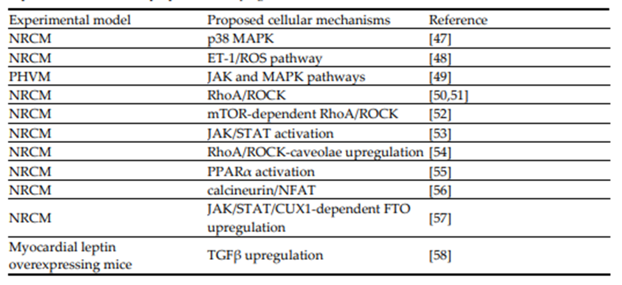 An important issue to address is the nature of adipokine contribution to risk or severity of cardiac disease, including the development of heart failure seen in obese individuals which occurs Preprints.org (www.preprints.org) | NOT PEER-REVIEWED | Posted: 27 November 2025 doi:10.20944/preprints202511.2058.v1 © 2025 by the author(s). Distributed under a Creative Commons CC BY license. 5 of 38 secondary to metabolic cardiomyopathy seen under conditions of obesity. As already noted, obesity itself has become a major world health concern. Data from the WHO show that one in eight people in the world were living with obesity in 2022 (Obesity and overweight fact sheet available from: https://www.who.int/news-room/fact-sheets/detail/obesity-and-overweight). Although long considered as a major factor in heart disease development, the exact contribution of obesity is somewhat difficult to assign specifically in view of the underlying complex factors involved as well as the potential role of the obesity paradox as a complicating factor is assessing the role of obesity in cardiovascular disease. In addition, the anatomical location of increased adiposity, age of the patient and the existence of other risk factors can all ultimately contribute to the cardiovascular disease process in general [4] and, of relevance to this review, heart failure in particular. It appears that the primary heart failure subtype seen in obesity is diastolic dysfunction associated with heart failure with HFpEF [27]. In terms of fat distribution, excessive visceral fat is considered of particular importance in the development of heart failure [28] and clinical studies have shown that visceral adiposity, but not subcutaneous abdominal fat, even in the absence of heart failure was associated with concentric hypertrophic remodeling and significantly reduced left ventricular function [29]. In addition, epicardial adipose tissue may contribute to the development of heart failure via profibrotic and proinflammatory pathways [30,31]. The mechanisms by which obesity contributes to heart failure and cardiac dysfunction are varied and complex and involve defective energy metabolism and myocardial structure [32–34], disruption of autophagy [35], as well as many other metabolic and cellular defects [36,37]. Determining the role of adipokines and identifying the specific adipokines potentially involved in the development of heart failure is indeed a challenging task particularly in view of the large number of adipokines thus far identified and the diverse and indeed, opposing effects these adipokines exert on cardiovascular health [38]. As reasonably suggested by these authors, targeted interventions that affect distinct pathways would help to identify specific functions of individual adipokines affecting heart failure and potentially result in improved and novel therapeutic strategies [38].Leptin and Adiponectin and the Critical Importance of the Leptin/Adiponectin Balance When considering all adipokines thus far identified it is evident that leptin, initially identified as adipocyte-derived satiety factor by Jeffrey Friedman’s group in 1994 through cloning of the ob/ob gene [39], represents the most widely studied of these proteins not only with respect to appetite regulation and effects on energy balance but as a modulator of the cardiovascular system with respect to its influence on disease processes in general and myocardial hypertrophy and heart failure specifically. The contribution of leptin to myocardial remodelling and the proposed underlying mechanisms have been reviewed in detail by the authors and other investigators. Accordingly, this will not be comprehensively discussed here and interested readers are directed towards several recent reviews which discuss these issues [41–43]. Briefly, there is evidence that leptin, derived from either adipose, vascular or cardiac tissue contributes to the remodelling process in either a hormonal, paracrine or autocrine manner [44,45]. Leptin exerts these effects by directly acting on specific receptors which are expressed in the cardiomyocyte as well as other cardiac components such as fibroblasts. These receptors actually represent a family of six receptors termed ObR (or LepR), members of the Class 1 cytokine receptor family, which possess identical extracellular domains but which differ markedly in the composition of their intracellular domain which dictates the nature of the intracellular signalling pathway. The only exception to this is the ObRe receptor which functions as a soluble leptin binding receptor which is not anchored to the cell membrane and which is thus unable to transduce any downstream cellular signalling. The ObRb receptor which encodes the full intracellular domain likely represents the primary receptor activating pro-remodelling cell signalling pathways. Although from a general perspective, ObRb activation leads to JAK2-STAT3 activation in many cells, stimulation of non-JAK2-dependent pathways has also been documented [46]. Indeed, as summarized in Table 1 the pro-remodelling/hypertrophic effect of leptin has been linked to activation of various intracellular signalling mechanisms. Table 1. Summary of studies demonstrating pro-hypertrophic/pro-remodelling effects of leptin in various experimental models and proposed underlying molecular and cellular mechanisms.