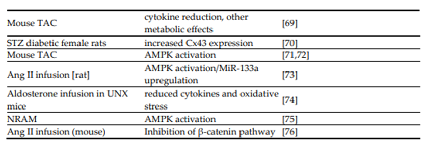 Adiponectin, initially referred to as Acrp30 (for adipocyte complement-related protein of 30 kDa), was first identified in 1995 [59]. It is also the most abundant of the known adipokines in terms of serum concentrations and, interestingly, its plasma concentration inversely correlates with the degree of adiposity [60,61]. Adiponectin produces its effects by binding to its receptors termed AdipoR1 or AdipoR2 [62] with both receptors as well as adiponectin shown to be expressed in adult ventricular myocytes and linked to AMPK activation [63]. Indeed, AMPK activation and the resultant subsequent suppression of ERK activation, have been proposed as primary mechanisms underlying the antihypertrophic effect of adiponectin involving both AdipoR1 and AdipoR2 activation [64,65]. However, of the two receptors, AdipoR1 likely represents the primary receptor subtype underlying the antihypertrophic effect of adiponectin. For example, patients expressing an AdipoR1 mutation demonstrate hypertrophic cardiomyopathy whereas overexpression of mutant AdipoR1 in cultured cardiomyocytes or the expression of the mutant receptor in transgenic mice leads to hypertrophic responses in the absence of any other intervention [66]. These hypertrophic responses were shown to be mediated via p38/mTOR and/or ERK1/2 pathways and reversed by rapamycin [66]. Moreover, adiponectin knockout mice demonstrate an enhanced hypertrophic response to pressure overload produced by thoracic aorta banding [64]. Accordingly, adiponectin and leptin could be considered as adipokines exerting opposite effects on the cardiovascular system. As summarized in Table 2, evidence for a direct antihypertrophic effect of adiponectin is quite extensive based on studies using a variety of experimental models. Table 2. Summary of studies demonstrating anti-hypertrophic/anti-remodelling effects of adiponectin or adiponectin agonists in various experimental models and proposed primary underlying molecular and cellular mechanisms.