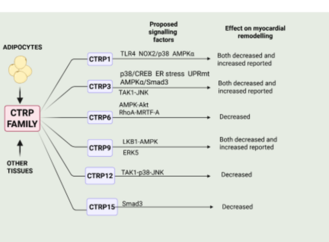 CTRPs represent a family of adiponectin paralogues exerting proinflammatory effects which have been shown to modulate a myriad of conditions including cardiovascular disease such as coronary artery disease via their ability to modulate the development of atherosclerosis [reviewed in 240, 241]. However, the complexity of their actions is underscored by the fact that at least 15 of these proteins have been identified possessing diverse biological effect including diverse effects on myocardial remodelling and heart failure acting through various cell signalling processes. A number Preprints.org (www.preprints.org) | NOT PEER-REVIEWED | Posted: 27 November 2025 doi:10.20944/preprints202511.2058.v1 © 2025 by the author(s). Distributed under a Creative Commons CC BY license. 17 of 38 of these proteins have been studied in terms of their ability to modulate the myocardial disease and the remodelling process in particular.