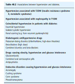 causes of hypertension in diabetes the association between high blood pressure and diabetes is shown in Table 40.2. Vital and remote systolic hypertension is common in the non-diabetic population (particularly in the elderly). It is anticipated that important high blood pressure is due to approximately 10% of cases in people with diabetes. Other crucial reasons are hypertension that coexists with IR, obesity, and IGT in metabolic syndrome, and high blood pressure secondary to diabetic nephropathy, as qdiscussed in detail below.