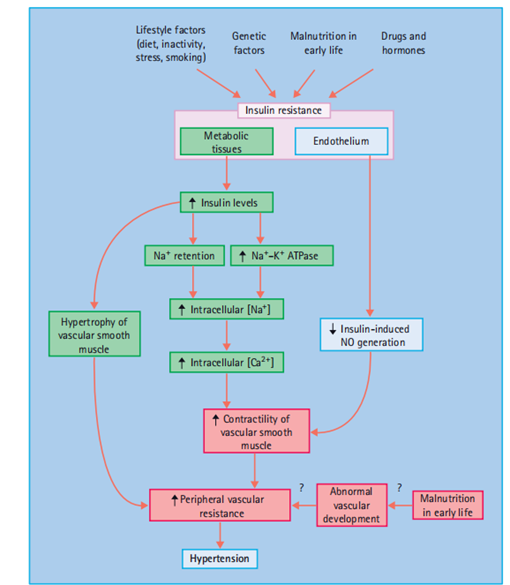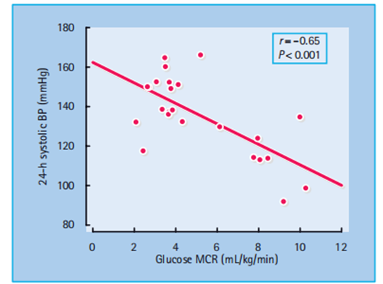 IR has been proposed via Reaven [2], DeFronzo and Ferrannini [14] and others [15] to be an essential reason for high blood pressure and cardiovascular sickness (CVD) as well as T2DM. IR is partially Genetically determined factors, including obesity, physical inactivity, and perhaps malnutrition in utero and during early infancy, may also contribute [16]. In support of the latter, family studies have revealed a correlation between the BP of the mother and her offspring that appears to be non - hereditary in origin; early growth retardation is suggested to program abnormal development of the vasculature as well as the tissues that regulate glucose homeostasis IR is closely associated with a high BP in both humans and animals. Experimental induction of IR (e.g., feeding rats fructose) is accompanied by an increase in BP. An inverse relationship has been demonstrated in humans between BP and insulin sensitivity [17] (Figure 40.2).
