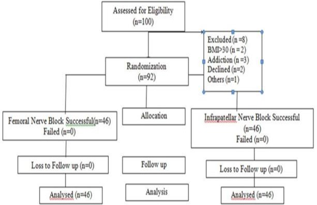 This study included 92 patients who were referred to Rasoul Akram Hospital, Tehran, Iran, for elective ACL surgery. The patients were assigned to the IPNB (n=46) and FNB groups (n=46). Figure 1 illustrates the consort flow chart.
