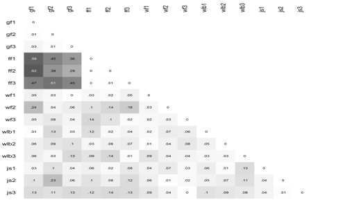 The analysis of covariances between the indicators suggests the inclusion or not of other indicators if the values tend to unity (see Fig. 1). The results indicate the inclusion of indicators related to the first and fourth factors. The shaded areas indicate possible collinear relationships between the reagents. That is, the reagents share a common factor, although the assigned factor has a greater influence.
