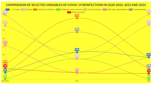Reinfections are mild, infrequent in people over 65 years of age (although with a trend towards greater frequency in 2023 and 2024). There is a tendency to increase the frequency in women (predominant in 2020-2022 and 2024) [p= .002663] and chronic diseases presence (higher in 2020-2022 and especially in 2024) [p= .038334] which by groups tend to decrease in 2024 except Musculoskeletal, Nervous and Senses and Digestive system which increase strongly. The frequency of Health Care Workers with reinfections was high, with a peak in 2023 [p= .000978]. 67% of reinfections in 2024 had only 1 , 2 or 3 doses of vaccine. There were no differences between the frequencies of symptoms, but general symptoms always predominated, with a tendency to increase.