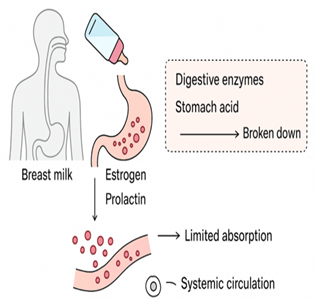 Peptide hormones such as prolactin and growth factors are largely denatured by gastric acid and proteolytic enzymes, limiting systemic absorption⁹. Lipid-soluble steroid hormones may survive partially, but their levels are insufficient to produce endocrine effects². Adult gastrointestinal permeability and enzymatic activity contrast with neonatal physiology, which allows some hormone bioavailability.[5]