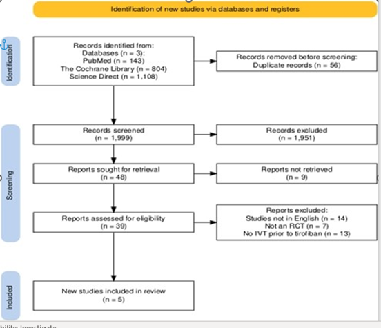 Acute Ischemic Stroke (AIS) is considered to be one of the leading causes of death among Americans, as approximately one in 19 people suffer from this pathology and end up losing their lives. [1]. It poses a significant financial burden on the healthcare system, as well as nursing people back to life after having suffered an ischemic stroke, which requires emotional, physical, and monetary strength for the suffering families. Globally, stroke of ischemic etiology comprises approximately 87% of all stroke cases, hence, inducing a substantial burden on the healthcare facilities all around the world. [2]. AIS occurs when a major vessel supplying blood to the brain develops an infarct, and the area being supplied becomes ischemic, resulting in neuronal damage and loss of body function, unless the affected area is reperfused using various techniques. Currently, the treatment modality being widely used to treat patients reporting with neurological deficits secondary to AIS is Intravenous Thrombolysis (IVT) using reactivated Tissue Plasminogen Activator (rt-PA). Thrombolysis, achieved either by alteplase or tenecteplase, helps restore perfusion by lysing the clots and allowing for adequate re-canalization of the occluding vessels. This modality is most commonly used in large vessel occlusion and helps restore perfusion in areas that are much-needed. [3]. However, there are certain areas where the efficacy of IVT is questioned. Research suggests that even after adequate re-canalization, almost 14-34 of the patients are unable to restore neurological function due to re-occlusion or formation of recurrent arterial thrombi. [4]. Moreover, IVT is also associated with intracerebral hemorrhage, further worsening the functional outcomes of the concerned patients. [5]. Recently, many other pharmacological agents have been explored that inhibit re-thrombosis and increase the efficacy and safety profile of mechanical options when used in conjunction. Among these options, the use of antiplatelet agents is extremely popular these days as they inhibit the formation of microthrombi after mechanical treatment options such as IVT. Among these options, Tirofiban has been gaining considerable interest as it is a reversible platelet surface glycoprotein inhibitor that inhibits platelet aggregation, thereby reducing clot formation. [6]. It has a shorter half-life and a reversible mode of action, making it suitable for acute infarcts and acute states such as AIS and other acute coronary syndromes. Currently, many studies are being conducted to explore the role of Tirofiban in the management of Acute Ischemic Stroke, especially in cases where IVT of mechanical Thrombectomy has remained unsuccessful or partially effective. Many studies suggest that there is a noticeable improvement in neurological functional score and the general outcomes of the patients who have received Tirofiban after IVT. [7]. Moreover, there was no increased risk of intracranial hemorrhage associated with Tirofiban in conjunction with IVT compared to IVT alone. However, despite raging evidence regarding the importance of Tirofiban therapy in AIS, there are some concerns regarding its safety profile and the association of this agent with intracranial bleeding a few days after the procedure. [8]. Heterogeneity in study design, patient groups, dosing regimens for Tirofiban, and definitions of outcomes makes individual results difficult to interpret. Most of the available evidence comes from single-center studies or post-hoc analyses with small patient numbers and poor quality of care. A limited consensus exists on the optimal timing, dose, and patient selection criteria; therefore, it is necessary to conduct a systematic review of the available data to inform these decisions. Consequently, it is essential to understand and interpret the safety and efficacy of this treatment modality in acute ischemic stroke patients. Given the findings discussed above, it is a matter of hours to establish analytical evidence regarding the efficacy and superiority of Tirofiban in the prevention of secondary outcomes after an initial episode of acute ischemic stroke, to make this treatment regimen an essential part of clinical practice all around the globe, and ensure a homogeneity in guidelines addressing stroke prevention and recurrence. The primary aim of conducting this meta-analysis is to evaluate and contextualize the effectiveness of Tirofiban in combination with IVT in patients diagnosed with acute ischemic stroke, to inform the development of current clinical guidelines and provide optimal healthcare to patients presenting with this condition.