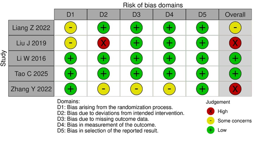 Of the five included trials, only two had an overall low risk of bias. The study by Liang Z et al. (2022) raised concerns about the randomization process, which in turn raised concerns about the overall validity of the research. [11]. While the studies by Liu J, et al. 2019 and Zhang Y, et al.