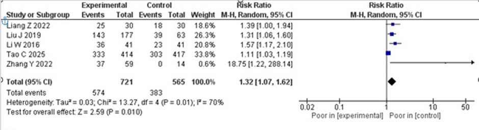 outcome compared to the experimental group receiving tirofiban after IVT (RR 1.32; 95% CI 1.07–1.62; p = 0.010). Despite the significant results, moderate statistical heterogeneity was observed, with an I2 value of 70%. The forest plot of mRS scores is presented in Figure 3.