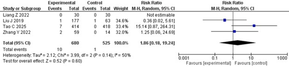 (RR 1.86; 95% CI 0.18–19.24; p = 0.60), but the result was not statistically significant. However, mild statistical heterogeneity was observed, with an I2 value of 50%. The forest plot for SICH is shown in Figure 4.Figure 4: Forest plot of symptomatic intracranial hemorrhage (SICH). Risk ratio for SICH in IV thrombolysis alone versus IV thrombolysis plus tirofiban groups.