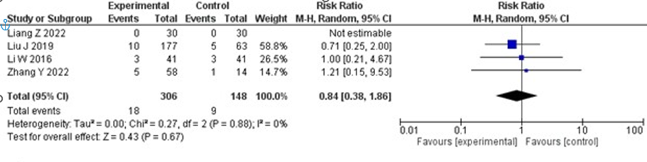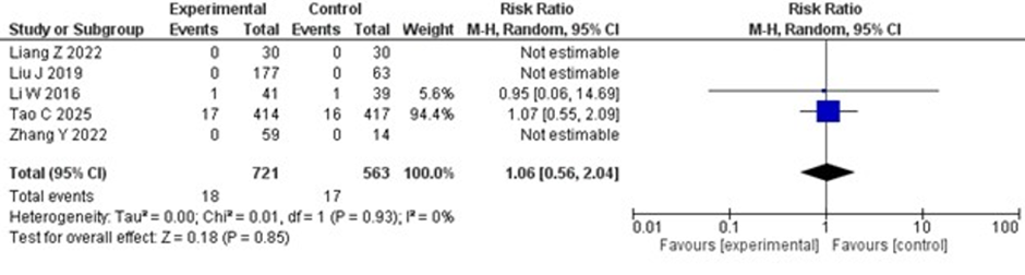 studies. Among the two studies that reported mortalities, no significant difference was observed between the two groups (RR 1.06; 95% CI 0.56–2.04; p = 0.85), with no heterogeneity. The forest plot for mortality is shown in Figure 6.