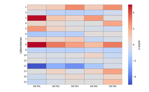 Figure 2: Heatmap of z-scores for the results of 15 laboratories across five control samples (M1– M4.5). White indicates exact agreement with the median (zero deviation); red shades indicate results higher than the consensus (positive bias), blue shades indicate lower results (negative bias). Color intensity is proportional to the magnitude of deviation (z-score scale shown on the right); the black dashed line marks the ±3σ limits. Most laboratories’ deviations fall within ±2–3σ (gray background), with the exception of two systematically biased profiles – bright red (lab #8) and bright blue (lab #12).