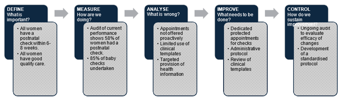 Healthcare in the United Kingdom is provided through the publicly funded, comprehensive and universal National Health Service (NHS). Primary care is delivered by an independent GP contractor model. The responsibility of community postpartum care is shared between midwives, health visitors and general practitioners. The project was undertaken in a general practice that serves the Stretford area in Trafford, a metropolitan borough of Greater Manchester, England. Trafford’s Index of Multiple Deprivation (IMD) Score in 2021 was 16.1 compared to the national average of 21.7 [17]. The practice population is approximately 14,000 patients. The project aim was to meet the standard of care defined by the National Institute for Health and Care Excellence (NICE) Guidelines on Postnatal Care [NG194] that all eligible women undergo a postnatal check within 6-8 weeks after delivery [18].