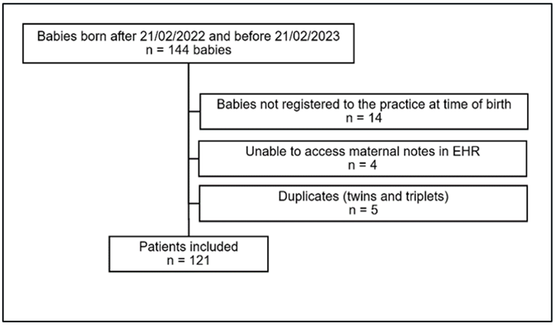 A retrospective clinical audit between April 2022 and April 2023 was undertaken to evaluate practice performance. During the audit period, the practice operated a digital-first patient-initiated model of access for unplanned clinical activity. The practice did not have a formal process for the delivery of postnatal checks to eligible women. Results were benchmarked against NICE Guidance on Postnatal Care [NG194] which recommend that every eligible woman should have a postnatal check 6-8 weeks after delivery [18]. Initial practice population searches reliant on clinical codes ([postnatal examination], [full postnatal examination], [postnatal maternal examination], [postnatal visits], [postpartum care], [Complete postnatal care], [[RFC] post-natal]) within our electronic health record (EHR) software, EMIS [19]. produced an incomplete data set when compared to the estimated number of babies born within the same time period of February 2022 to February 2023. To identify all eligible women, a patient search was run for “Babies born after 21/02/2022 and before 21/02/2023” on all registered patients in the practice. This identified 144 babies compared to the 29 women identified on searches dependent on clinical codes. Babies not registered to the practice at the time of their birth and babies where the maternal clinical notes could not be accessed were excluded. The baby’s mother was identified either via the “Household” information on EMIS or through Birth Certificate information. The mother’s patient record was reviewed for attendance at a postnatal appointment. Attendance at a postnatal appointment was recorded if a clinician used a postnatal check clinical code or, on reviewing clinical notes with no code, a systematic postnatal review of the patient was undertaken. Appointments that addressed a single issue (e.g. haemorrhoids, contraception prescriptions, mental health reviews) were not considered to be a comprehensive postnatal review. For individuals that did not have a postnatal check, appointments data was reviewed to determine if an appointment was offered. Checks completed within 40 – 58 days were accepted as being completed within ‘6-8 weeks’ to allow for flexibility in appointments arrangement. Ethnicity data, as self-reported by patients, were taken from patient records. Ethnicity data was not aggregated as recommended by Arrington et al. [20]. Data was collected by the author and input into and analysed using Microsoft Excel. A total of 121 patients eligible for postnatal checks were identified once multiple births were accounted for.