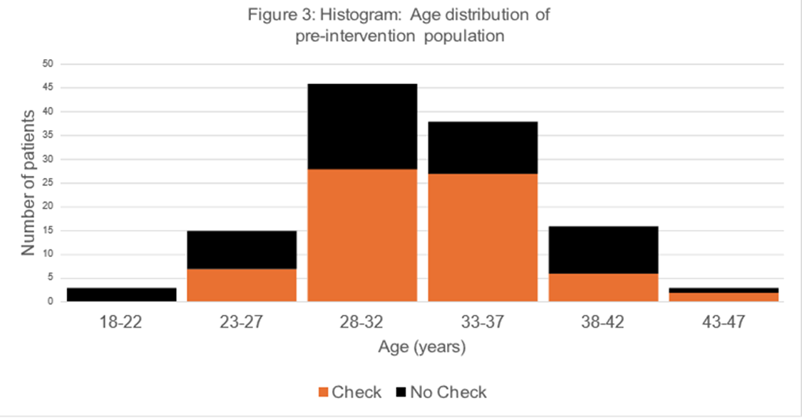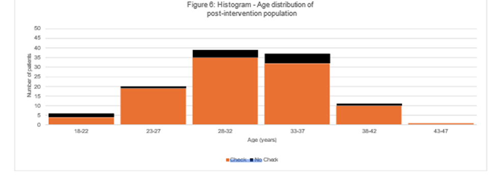 additional appointments. If the date and time of the appointment was unsuitable, we endeavoured to book the appointments at an alternative time suitable for the patient. The protected appointments were introduced in April 2023. The clinic was continuously audited following its initiation to identify potential barriers to access and learning was shared to sustain improvement. The intervention successfully improved practice performance in the provision of mother and baby checks. A total of 112/114 (98%) of eligible women were offered a postnatal check appointment. After 12 months, we saw improved uptake of maternal postnatal checks from 58% (70/121) to 89% (101/114) and appointments performed within 6-8 weeks improving from 59% (42/70) to 76% (77/101). Seven women accepted offered appointments then cancelled their appointments. Four women did not respond to the maximum of three appointment invitations. Figure 6 shows the age distribution of the post intervention population.