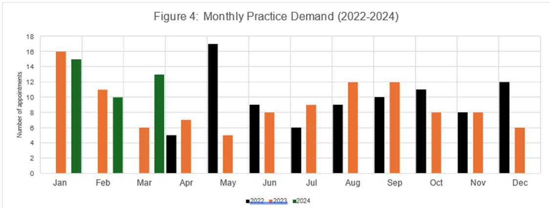 The audit showed a suboptimal uptake of postnatal care and in those who did have a check, 60% were completed within the NICE recommendations of 6-8 weeks. Of the patients who did not have a postnatal check, 2/51 (4%) were pre-emptively offered an appointment indicating a need for an improved method of access to appointments. Monthly data was analysed to understand practice demand over 12 months. Monthly appointment requirements ranged between 5 to 16 appointments per month (see Figure 4).