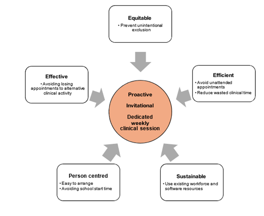 The Greater Manchester Quality Improvement Framework identified six dimensions to be considered when approaching healthcare improvement [21]. Following analysis of appointment data, we developed a patient- centred model of access that prioritised equity to all eligible patients that could be promptly deployed. As rapid innovation, efficiency and sustainability was required, we explored adaptations to our established clinical processes, as outlined in Figure 5.