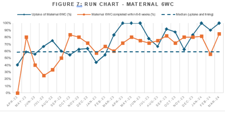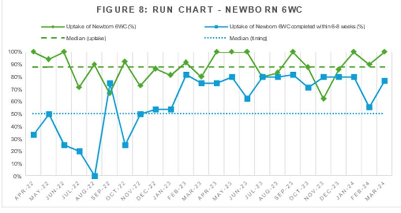 The uptake of newborn checks improved from 86% (113/132) to 91% (106/116) and appointments performed within 6-8 weeks improved from 46% (52/113) to 75% (80/106) [see Figure 7].