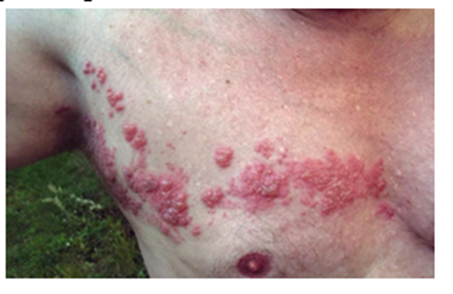 On 4th day of onset of listed symptoms, I noticed a single stripe of blisters that wrapped around the right side of my chest over thoracic ribs no 3-6. I had sought the treatment from a private dermatologist in New Delhi. She had put me on antiviral oral drugs for one-week, local application of smoothening powders and analgesics. Though the blisters healed over 2 weeks, the neurologic pain bothered for well over 2 months.