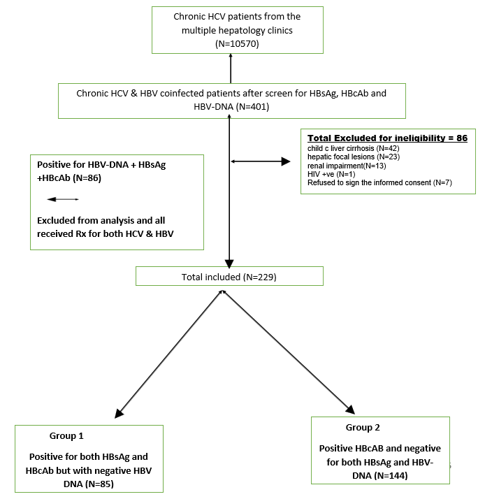 A total of 10570 chronic hepatitis C patients from the Attendees of the Virology unites were screened for HBV coinfection by HBsAg and anti-HBc, then HBVDNA was done for positive patients for one or both markers. Two hundred and twenty-nine patients were HBV DNA negative, of them 85 patients (27.3%) were positive for both HBsAg and anti-HBc and 144 patients (45.7%) were positive anti-HBc and negative for both HBsAg. All included patients received one tablets containing 400 mg Sofosbuvir and 90 mg of ledipasvir once daily for 12 weeks. Patients enrolment described in (figure 1).