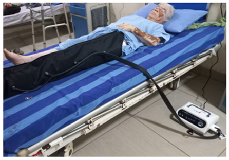 After a thorough examination a general surgeon and the plastic surgeon tried Crape elastic bandage for a week. On this authors intervention both opined that surgical debridement at her age is risky and either the bandaging or even better is to use Pneumatic Pressure technique. After discussions a Pneumatic pressure, specifically in the form of Intermittent Pneumatic Compression (IPC) or Sequential Intermittent Pneumatic Compression (SIPC) was considered best option. SIPC equipment was bought costing INR 35,000.