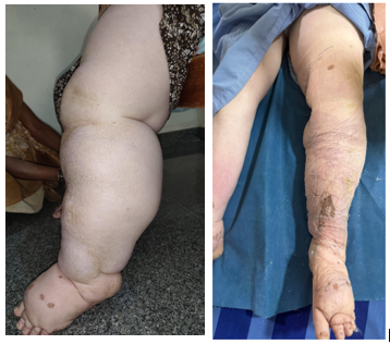 Filarial Elephantiasis or lymphatic filariasis is a parasitic infection caused by 3 species of parasitic worms namely Wuchereria Bancrofti, Brugia Malayi, Brugia Timori, transmitted by Culex, Anopheles, and Aedes mosquitoes. It causes chronic, irreversible lymphatic damage, leading to severe swelling of legs known as elephantiasis or the scrotum – ‘Hydrocele’. Lymphatic filariasis impairs the lymphatic system and can lead to the abnormal enlargement of body parts, causing pain, severe disability restricting mobility and social stigma [1,2]. It commonly occurs between 30-45 years of age and a little more commonly in males than in females, it is usually unilateral; but rarely bilateral with one limb in higher grade than other as was in our case. Clinically lymphoedema is classified into 4 stages [3,4].
