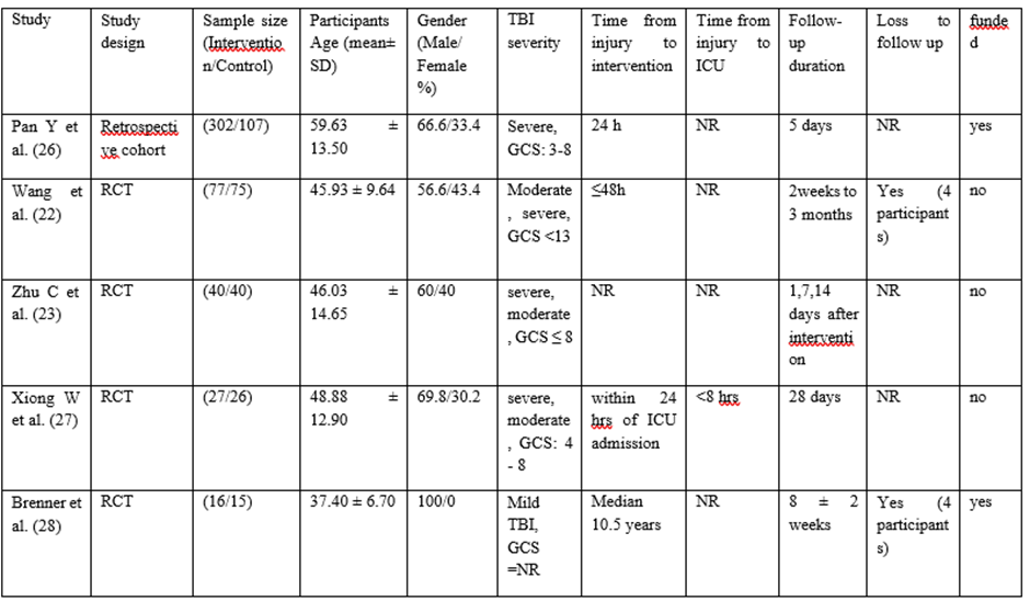 5 studies met the inclusion criteria and were retained for final analysis. Among these, 1 was a cohort study and 4 were randomized controlled trials (RCTs). Data were independently extracted by O.B. and Z.R. using a standardized pilot-tested form. Extracted variables included: first author, country, funding source/conflict of interest, study design, effect size, bias selection/ confounding : matching or regression, Setting, Population (age, sex, undelying disease), TBI severity, Time from injury to intervention, intervention, comparator, Concomitant Treatments, Sample Size intervention, Sample Size control, Loss to Follow-up / Attrition (number of withdrawals/dropouts, Sex distribution of withdrawals, Reason for withdrawal), Baseline characteristics (p value)(Age, male (n), GCS score on admission mean, Time from injury to ICU mean), Follow-up Duration, Primary Outcomes, Secondary Outcomes, Microbiome Outcome Details (diversity (Alpha diversity, Beta diversity), composition, F/B ratio), Outcomes Measurement Tools, Effect size (CI) (Binary, Continuous, Time to event), Statistical Adjustments / Covariates (Adjusted, unadjusted), Adverse Events (Occurrence / Reported (Yes/No / Not reported), Type of adverse event, Frequency in intervention group), Microbiome Assessment Method (sample, Processing, Sequencing method), Main Findings, Risk of Bias, GRADE Assessment, Notes. Any discrepancies were resolved by consensus or through a third reviewer (F.V.). The extracted data from the included studies are presented in Supplementary Table S2, which provides a comprehensive summary of their key characteristics.