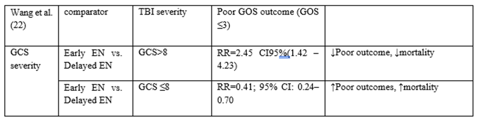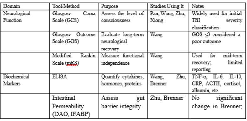 • Reported clinical or functional outcomes in TBI patients (e.g., Glasgow Coma Scale [GCS], Glasgow Outcome Scale [GOS/GOS-E], mortality, hospital/ICU length of stay, infection rates, inflammatory or metabolic biomarkers);