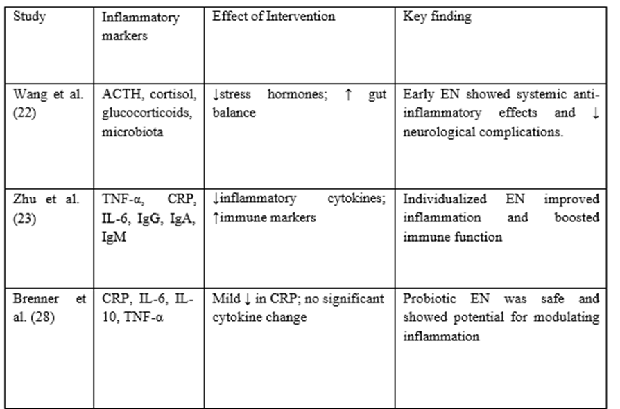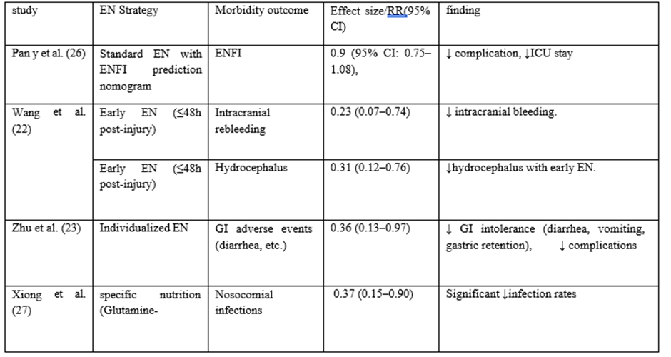 Among five eligible studies (four RCTs and one cohort; n = 725), early or individualized enteral nu trition and probiotic supplementation were generally associated with better metabolic and inflamat ory profiles, fewer gastrointestinal complications, and a non significant trend toward improved neurological scores (GCS, GOS). However, effect sizes were s mall and certainty low due to limited sample sizes and methodological heterogeney.