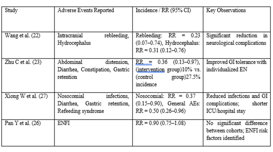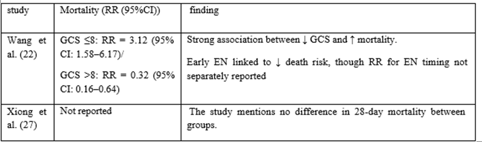 Meta-analyses were performed using R (version 4.5.1; meta and metafor packages). For continuous outcomes (e.g., Glasgow Coma Scale), standardized mean differences (SMDs) with 95% confidence intervals were computed using the HartungKnapp adjustment for random effects mo dels. For binary outcomes (e.g., feeding intolerance, infection), risk ratios (RRs) were pooled usin g the same model. Between-study heterogeneity was quantified with I² and τ². GRADE methods w ere applied to rate the certainty of evidence for each outcome domain. A random effects model was applied for all pooled effect estimates, using the inverse variance method for weighting and the Hartung–Knapp–Sidik–Jonkman adjustment to improve small sample inference. Statistical heterogeneity was quantified with the χ² test (Cochran’s Q), the I² statistic (percentage of total variability attributable to between study differences), and τ² (between study variance). Where appropriate, a 95% prediction interval was calculated to convey the range of likely true effects in future comparable studies. Forest plots were generated with modern syntax avoiding deprecated arguments, specifying left hand study and event columns, diamond markers for pooled effects, and green squares for study level estimates. Funnel plots were visually inspected to assess potential small study publication bias; however, with only two studies per outcome, Egger’s regression test was not performed due to low power.