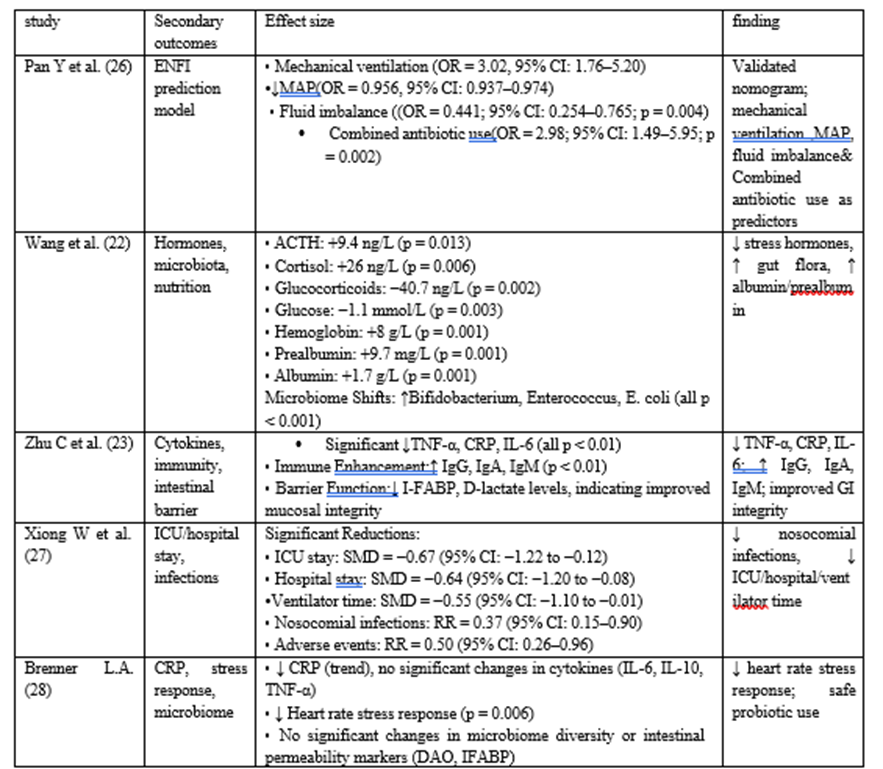 Most included trials were small single-centered. Sample sizes per arm ranged from 15 to 50 participants (Xiong [27]: n = 31; Zhu [23]: n = 40; Wang [22]: n = 150 total; Noshad [25]: n = 140 total; Asaadi [30]: n = 118 total; Brenner [28]: n = 31). This limitation in sca le and follow- up introduces instability in effect-size estimations and prevents definitive mortality conclusions. C onsequently, the meta- analysis yields low-to-moderate certainty ratings for most primary endpoints as reflected in the GR ADE sheet. Formulations ranged from single-strain probiotics (Lactobacillus reuteri DSM 17938 in Brenner [28]) to multi- strain combinations (Noshadi [25]) and glutamine-enriched enteral feeds (Xiong [27]). Dosing durations spanned 8 weeks to 28 days, some initiated ≤ 48 h post-injury and others > 1 week after ICU admission. Such disparities impede definitive dos e–response analysis. Another cross-study concern lies in blinding and allocation concealment. Of the five randomized trials, two did not explicitly describe randomization methods (Xiong [27] and Zhu [23]), and only Brenner [28] achieved a double-blind design. Performance and detection bias remain plausible, especially for subjective ou tcomes such as feeding intolerance or self-reported GI symptoms. Confounding was another issue,particularly in cohort designs. The Pan et al. [26] nomogram applied multivariate logistic regressio n to control for ventilation, MAP, and antibiotic use (OR ≈ 3.02, 2.98, respectively), but many othe r studies lacked statistical adjustment. This increases the risk that observed improvements stem par tly from better baseline stability or less severe illness in the intervention groups.