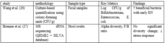 While our meta-analysis incorporated multiple endpoints, mortality remained non- significant (p = 0.31 in Xiong (27); non-reported in others) , and functional long- term indices such as GOS or mRS were rarely evaluated. The majority of outcomes were short- term-or mid-term , so the durability of neurological and microbial changes beyond hospital discharge is unknown. Mo reover, two studies did not quantify microbiome changes beyond culture- based counts, limiting comparability to sequencing- based evidence. Only Brenner’s trial used modern 16S sequencing (OTUs and UniFrac distances), whereas others relied on CFU/g culture. Consequently, conclusions about microbial-composition s hifts should be interpreted with caution. Another limitation was the absence of standardized definitions for feeding intolerance. Cut- off points for gastric residual volume or vomiting frequency differed between studies (Zhu [23] vs. Noshadi [25]), introducing measurement heterogeneity that may explain part of the remaining I² v ariance.