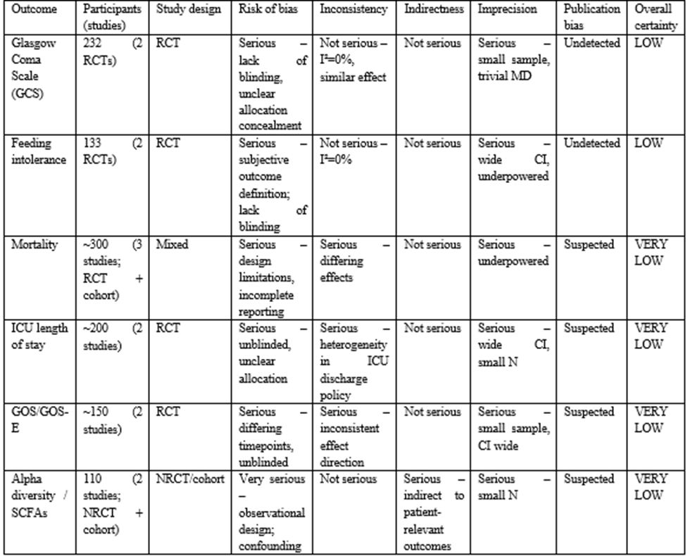 Across primary outcomes amenable to meta-analysis (GCS and feeding intolerance), the certainty of evidence was low due to risk of bias and imprecision, despite consistent direction of effect and direct relevance to the review question. Mortality, ICU length of stay, GOS/GOS-E scores, and microbiome diversity measures (alpha diversity / SCFA) were graded as very low certainty, primarily due to study limitations, small sample sizes, and incomplete or heterogeneous reporting. This means that future high-quality research is very likely to change these estimates and potentially the conclusions. In conclusion, while this review benefits from methodical comprehensiveness, clear data synthesis, and strong biological coherence, its evidence base remains constrained by limited sample power, heterogeneity of interventions, and incomplete microbiome characterization. These limitations do not negate the observed benefits but underline the necessity for large, multicenter, mechanistic RCTs integrating standardized feeding definitions, robust microbiome sequencing, and long-term neurological endpoints.